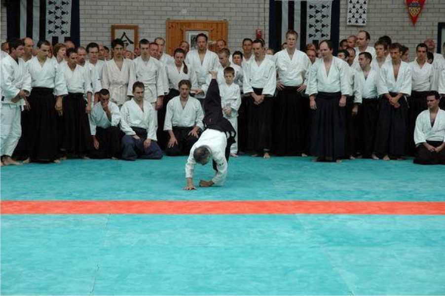 O-Sensei hacía regularmente demostraciones y debíamos caer sobre arena. Más que hacer ruido buscábamos una caída suave. Por el contrario, las demostraciones en las que se practicaba sobre tatami se hacían voluntariamente grandes caídas, ruidosas para impresionar al publico (risas).