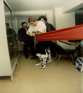 En ningún momento el maestro demostró inquietud. Yo lo veía muy a gusto en la espera con una copa de vino en la mano, pero parte de los directivos de AETAIKI se empezaron a poner nerviosos con inquietudes como “que si esto no se le podía hacer al maestro”, “que cómo le podíamos estar haciendo esperar”, etc. Entonces el maestro vio una silla y se sentó tranquilamente.