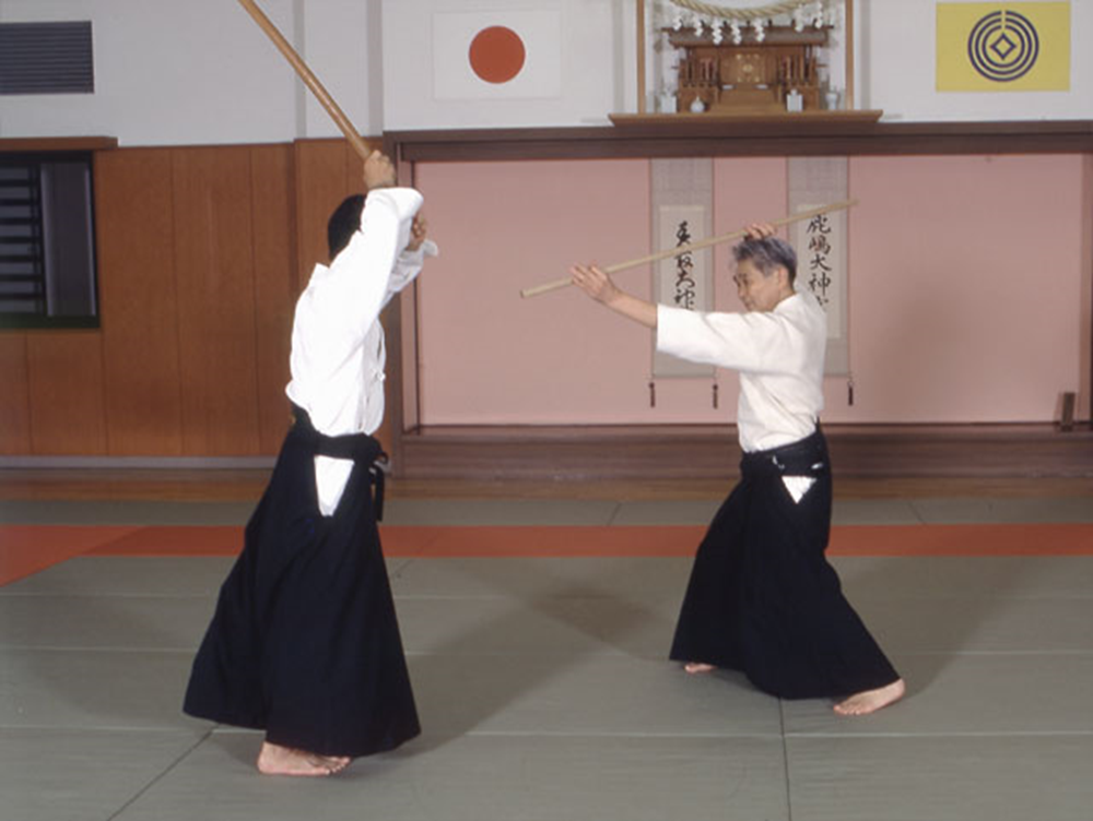 Siempre digo que si un profesor de Aikido retoma el ken, puede volver a aplicar sus conocimientos al ken. Y lo mismo ocurre con el jo. (Cuando era principiante) pregunté cómo aplicaban las técnicas corporales al ken, pero nadie me lo mostró. Como no había nada que hacer ante la situación, comencé a practicar el ken en 1955, poco después de comenzar a entrenar Aikido. ¿Qué más podría hacer? ¡Nadie me enseñó! O-Sensei hacía técnicas con la espada a la velocidad del rayo y decía: «Así es como se hace», y luego desaparecía del dojo. Intenté en vano entender lo que estaba haciendo y al momento siguiente ya no estaba. (Risas) Cuando me preguntaron: «¿Entiendes?» Yo respondía “Sí”, pero realmente no entendía nada. (Risas) Cuando pedí a otros senseis que me explicaran cómo lo hizo, simplemente respondieron: «Así es como lo hizo». No me mostraron nada. Entonces pensé que no podía hacer nada más que estudiar por mi cuenta. Entonces pensé que debería empezar desde el principio si quería hacerlo. Después de que comencé a estudiar el ken, comencé a apreciar cómo manejarlo adecuadamente. Cuando lo combiné con la forma de pensar del Aikido comencé a entender muchas cosas. Entonces entendí que lo que O-Sensei estaba diciendo tenía sentido.